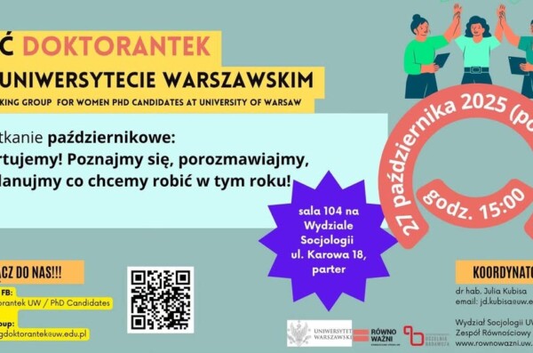 Wraz z rozpoczęciem nowego roku akademickiego startuje kolejny sezon Sieci Doktorantek na Uniwersytecie Warszawskim – inicjatywy tworzącej przestrzeń dla spotkań, wymiany doświadczeń i wzajemnego wsparcia pomiędzy doktorantkami UW. Spotkania Sieci ...