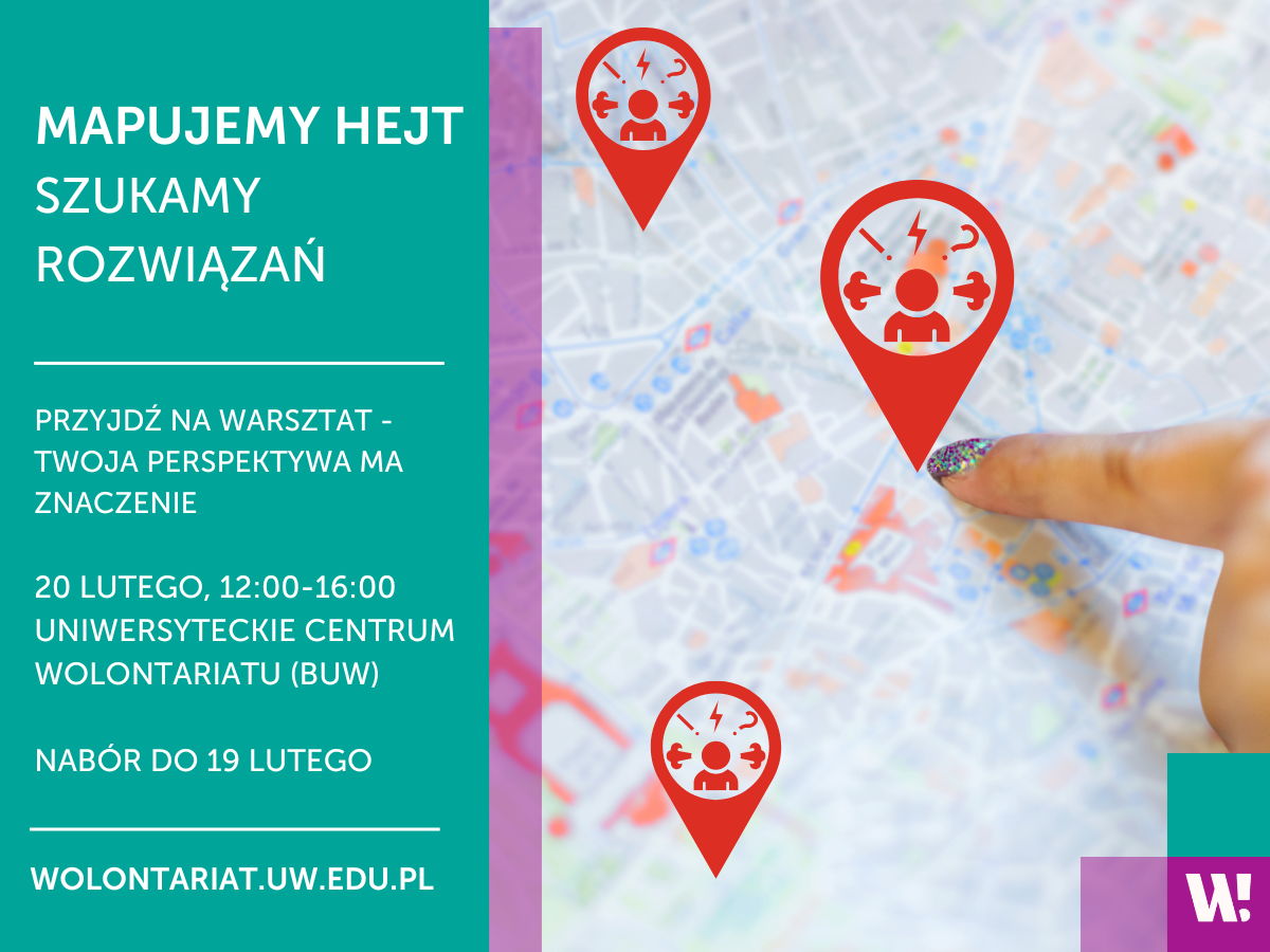 Jak się zgłosić? Wyślij mail na wolontariat@uw.edu.pl do 19 lutego 2026 r. – podaj swoje imię i nazwisko, wydział oraz nazwę warsztatu (Mapujemy Hejt).